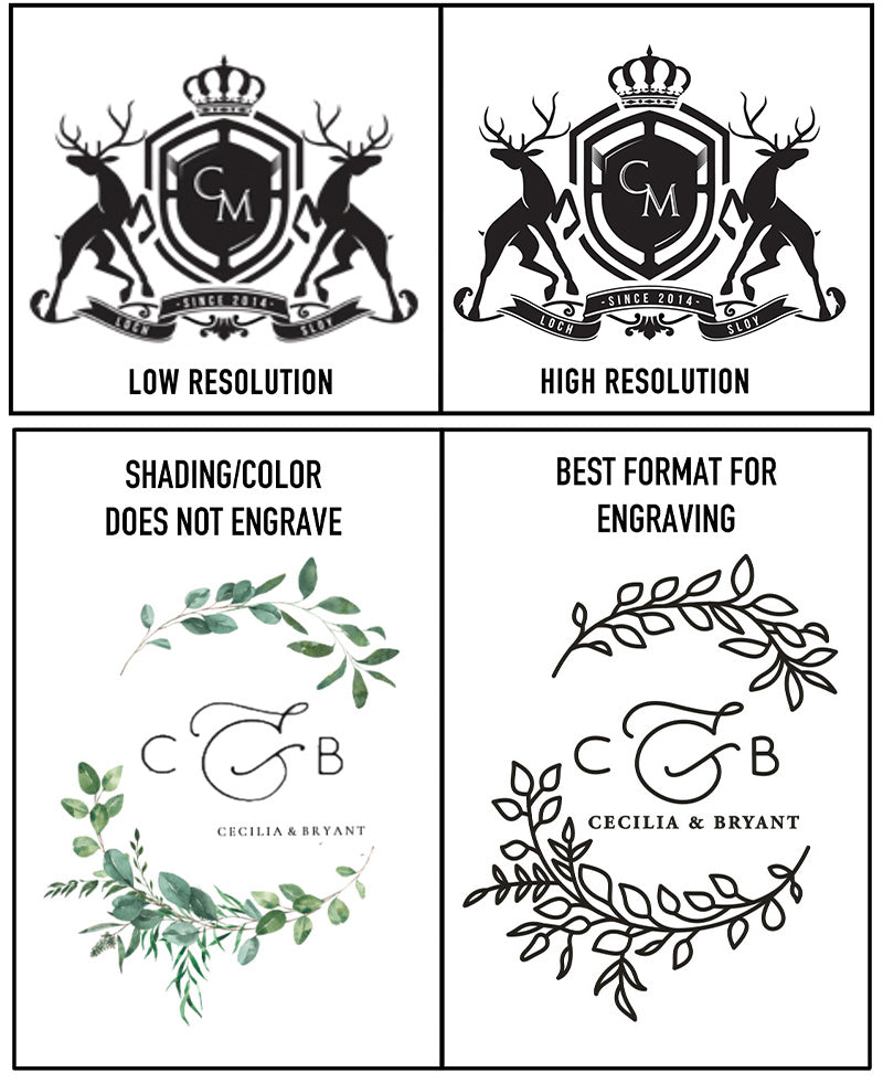 The quality of the image impacts the quality of engraving. Higher resolution images will produce a clearer engraving. Shading and color fill do not engrave. Occasionally color or shading is removed in order to engrave an image. We are not able to engrave photos of any kind. Vector images with clean lines and graphics works best. Best file types include .png, .jpeg, .pdf, and .eps.